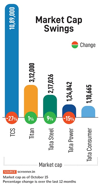 The last year has seen a fall in the overall market capitalisation of the group. This, combined with the fact that its mainstay IT services company, Tata Consultancy Services (TCS), has shown lacklustre growth. TCS, also its most valuable listed company, has seen an erosion of ₹295,000 crore. Its stock is down 27 percent in the last 12 months.