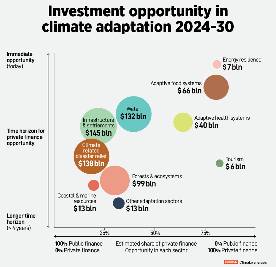 “Private sector capital has long believed that adaptation finance is public goods and not suited for commercial capital," they say. While this is true in areas such as disaster relief and support for climate migrants, “there is much that offers opportunity and needs focus from commercial ventures and funders."