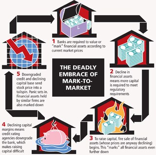 All that was abandoned once the economic meltdown began and asset prices plunged. In the US, market participants clamoured to relax MTM rules. In India too, the Confederation of Indian Industry made a case for relaxing MTM rules. The responses have been diametrically opposite. The US Securities and Exchange Commission (SEC) analysed all bank implosions and found that MTM accounting was responsible for only 10 percent of banks’ capital loss. Over 90 percent of the loss was because of credit losses or because borrowers weren’t paying back loans. The SEC did not dilute MTM standards.In India, the National Advisory Committee for Accounting Standards (NACAS) relaxed the guidelines for foreign exchange debt. Since dollar debt now costs more in rupees, Indian companies would have had to take this hit from the increase in the value of debt on their income statements.