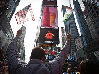 A supporter holds up the us and Indian national flags as he assembles at New York’s Times Square to watch Indian Prime Minister Narendra Modi’s simulcasted speech (delivered at Madison Square Garden) on a giant screen on September 28, 2014. Modi, who was on his first official visit to the US, attracted a record gathering of Indian-Americans—a three-million strong community—and enthralled the audience (that included US senators and Congressmen) with his oratory. He invoked Mahatma Gandhi and urged the diaspora to make India’s development a national movement like the freedom struggle. Acknowledging the visa problems faced by NRIs, Modi promised life-time visas to PIOs (persons of Indian origin), and also announced long-term visas for US nationals travelling to India for tourism purposes.