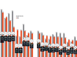 Amazon’s Jeff Bezos and Facebook’s Mark Zuckerberg, each a big gainer, joined the top 10 for the first time, while Buffett’s Brazilian partner, Jorge Paulo Lemann, and Chinese investor Wang Jianlin—who owns AMC Entertainment Holdings and is buying moviemaker Legendary Entertainment—made their top 20 debuts. Altogether, this group is worth $827 billion, or $49 billion (6 percent) less than last year’s group.
