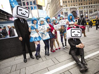 Attendees wearing anime costumes celebrate at the Nasdaq during Bilibili’s IPO in March Image: Michael Nagle / Bloomberg