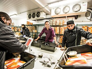 By 1 pm, the frenzy shifts to assembly lines where workers hand-pack compostable trays of couscous, chicken legs and greens. Stacks of meals pile up inside a vast refriger- ated room, where the operations team—in fleece and hats—sorts meals into bags and hands them off to runners, who weave past one another and dash out to their cars. By 4 pm, trucks full of refrigerated meals pull into parking lots in places like Rockridge and Burlingame, where they’re met by more drivers who pick up the evening’s goods in unmarked duffel bags and fan out on door-to-door routes guided by an app. “Few words are exchanged—it looks like a drug deal,” says Tri Tran, Munchery’s co-founder and CEO.