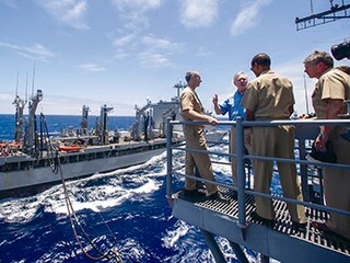 Scum ponds in the desert? The very idea conjures memories of the federal government’s decidedly mixed record at promoting alt-energy projects: Solyndra, FutureGen, A123’s electric-car batteries, synfuels in the 1980s, jojoba in the 1970s. Add to that all the many military boondoggles—Star Wars missile defence, for one—born of best intentions and bloated budgets. Chris Leschinsky for ForbesSecretary of the Navy Ray Mabus (in blue shirt) aboard the USS Princeton, as it loads up with biofuel from the USNS Henry J Kaiser