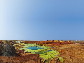 In the country's north lies the Danakil Depression, a surreal landscape showcasing the operatic rendition of nature, red and orange and yellow in tooth and claw