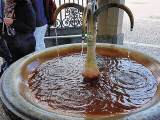 From Bäckerbrunnen, I make my way to the third-most popular spring called Schützenhofquelle, where the Romans built the first spa for their soldiers. The water is a few degrees cooler than the previous two, and contains sodium, calcium, potassium, magnesium, strontium, hydrogen carbonate and sulphate. In the 15th century, water from this spring was used in the bathing facility of Schützenhof, while in the 19th century, its water was used by a grand hotel by the same name. Today, the spring is surrounded by shops selling clothes and accessories.