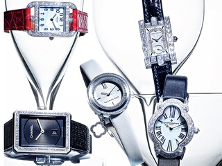 Photographs By David Arky Style Director: Joseph Deacetis Style Assistant: Maximillian Parkinson Set Design: Terry LewisCentre: 25mm white gold charms by Van Cleef & Arpels ($13,600). Clockwise from top left: 23mm gem-set stainless steel Hermès Cape Cod ($12,650) 21mm white gold and diamonds avenue classic by Harry Winston ($37,600) 26.5mm white gold and diamonds Heures Creatives Heure RomantiQue by Vacheron Constantin ($48,800) 26.7mm stainless steel and diamonds boyfriend tweed black by Chanel ($9,200).