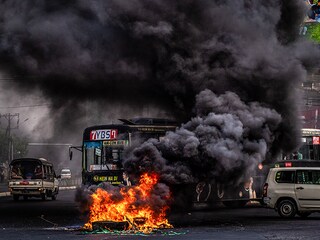 Smoke rises from tires set alight by anti-coup protesters on April 03, 2021 in Yangon, Myanmar. Myanmar"s military Junta continued a brutal crackdown on a nationwide civil disobedience movement in which thousands of people have turned out in continued defiance of live ammunition. Local media and monitoring organizations estimate that over 500 people have been killed since the coup began. Image: Photo by Getty Images/Getty Images
