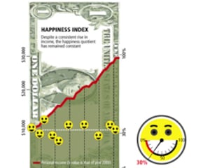 The value of moneyMore money doesn’t always bring happiness. A study cited by the Sustainable Scale Project in the US during 1957-2002 showed that as incomes kept rising, happiness levels increased up to a certain level and reached a plateau at some point. David Myers, professor of psychology at Hope College, Michigan, says, “Once people have enough money to feel secure, more money appears to yield diminishing returns.” This is seen in our daily lives too. “If I’m three times richer than my grandfather, and my car goes 65 mph faster, am I happier? It’s not a sensible measure,” Andrew Oswald, a member of Sarkozy’s commission, says.