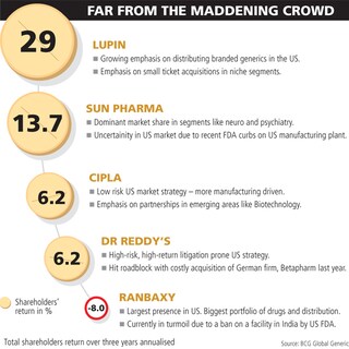 But the bigger and more interesting move is Lupin’s new focus in building a branded business in the US. Typically, putting a branded formulation in the market can cost a company between $1-2 million whereas Lupin’s acquisition of the Antara brand, a cholesterol-related drug, cost $38 million at one go. Says S. Ramesh, Lupin’s chief financial officer: “Profits from brands don’t fluctuate but grow unlike in the generic business.”