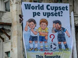 This photo taken on June 22, 2018 shows an Indian worker adjusting an Amul dairy products billboard on the side of a building in Mumbai. - Cartoons featuring everything from a pink and round-faced Donald Trump to cricket and Bollywood have been delighting Indians for half a century with pun-filled takes on the world"s biggest news stories. Image: Punit Paranjpe / AFP