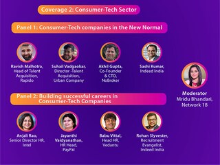The first of the two panel discussions at the online event, themed ‘Consumer-Tech companies in the New Normal’, focused on the Consumer-Tech industry, which is at an inflection point as it facilitates new trends through digitalization. With Mridu Bhandari, Editor - Special Projects, Network18, as moderator, human resource experts, Ravish Malhotra, Head of Talent Acquisition, Rapido Suhail Vadgaokar Director -Talent Acquisition, Urban Company Akhil Gupta, Co-Founder & CTO, NoBroker and Sashi Kumar, Indeed India, shared their views on the theme.