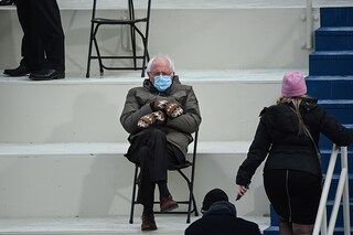 The Bernie Sanders meme, which went viral on social media, helped boost sales for the creator of his mittens. Image: Brendan Smialowski / AFP