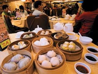 As he grumbled, though, he was leading us to his local dim sum joint. We climbed up two narrow flights of stairs, squashing ourselves against the wall to make way for Chinese businessmen in a perpetual hurry, turned a corner, and found ourselves in a vast, busy room dotted with tables set close together. The thrum of conversation was misleading: All the focus was on the bamboo baskets that were making their way through the narrow aisles, placed on the table and relieved of their lids with a flourish. For a moment, the chatter would cease as eyes peered at the contents of the basket. Then the chopsticks would emerge, selected dumplings would be transported to the plate and then to the mouth. And conversation would resume.