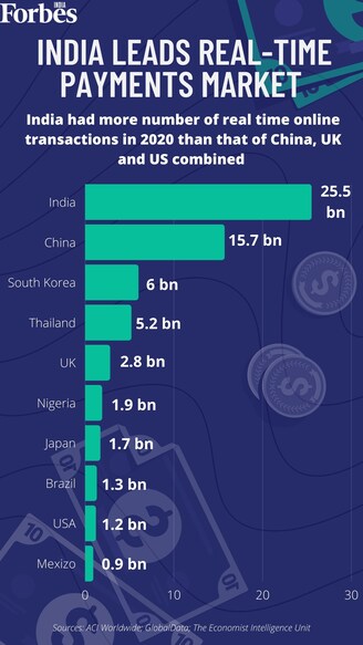 At 25.5 billion real-time online transactions, India surpassed China's 15.7 billion, UK's 2.8 billion, and US's 1.2 billion transactions in 2020 pandemic year