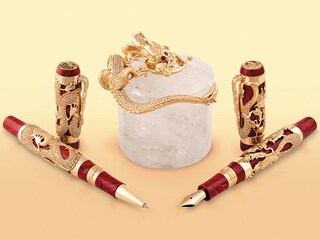 STYLEEnter the penMontegrappa’s reinvention of its Dragon pen—made of 18-karat gold and set with diamonds—pays homage to Bruce Lee. The pen features a body and cap made of cinnamon celluloid, red with black veining. Topping the cap is the yin-yan symbol. The cap and the barrel feature carved dragons in precious metal. The nib features the profile of Lee. This set consists of a fountain pen, roller ball, and inkwell. montegrappa.com