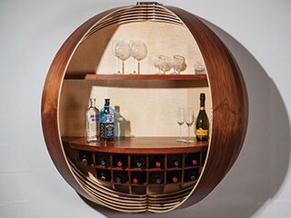 HOMECollapsible Globe The Dime cabinet evokes visions of a spinning coin: The curved segments glide and shuffle to reveal their function. Made of rosewood, ashwood, marble and stainless steel, the playful form allows the user to hide or reveal the worktop and storage solutions. Dime can function in myriad ways: As a cocktail cabinet, worktop for preparing food, a self-contained coffee station, a home admin desk, or a work pod.splinterworks.co.uk