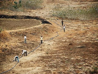 About 30 km from Lakshman’s village is a huge man-made lake—rather, it used to be a lake, we were told. Up from the embankment, about 30-40 feet high, what we see is not a lake but a huge field of melons. The melon plants are withering away and most of the tiny melons have started rotting for want of water. Villagers have dug two wells and are laying a pipeline to the nearest well where there is a pumping station to pump water to their village. All this is being done at their own cost (about Rs 2.5 lakh plus the labour they are putting in), whereas it costs Rs 3 lakh per month to get tankers to supply water to the village (assuming per capita per day consumption of 3 litres, in the village of over 4,200 people). The government prefers to supply tankers water rather than build pipelines.