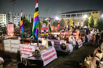 Relatives sitting on the back of vehicles mourn next to the coffin of their loved ones during the funeral for 13 people killed in a gunfight between armed groups in India"s Northeastern Manipur state, at Andro Khanarok, Imphal East, on December 5, 2023, amid ongoing ethnic violence in the state.Image: AFP