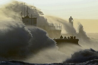 People watch as waves crash against the seawall at Porthcawl, South Wales, on February 18, 2022, as Storm Eunice brings high winds across the country. Britain put the army on standby on Friday and closed schools as forecasters issued two rare "red weather" warnings of "danger to life" from fearsome winds and flooding due to the approaching Storm Eunice. Image: Geoff Caddick / AFP