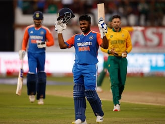 India"s batsman Sanju Samson celebrates his century during the T20 International cricket match between South Africa and India at Kingsmead stadium in Durban, South Africa, on Friday, November 8, 2024. Image: AP Photo/Themba Hadebe