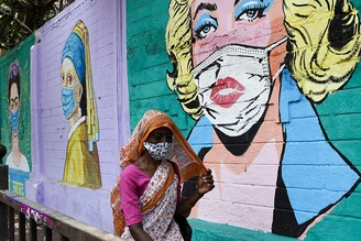 Celebrating World Art Day in the midst of a pandemic. A masked lady walks by renderings of masked portraits of famous personalities and artworks such as painter Frida Kahlo, Johannes Vermeer"s "Girl With a Pearl Earring," and actress Marilyn Monroe in Mumbai, India, April 13, 2021.Image: Deepak Turbhekar for Forbes India