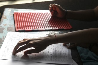 Visually impaired students write and read using the Braille system at the Sri Sai Junior College for visually challenged in Hyderabad on January 4, 2022. It is the 213th birth anniversary of Louis Braille, the inventor of the Braille system, a world-wide system used by visually impaired people to read and write.Image: Noah Seelam / AFP