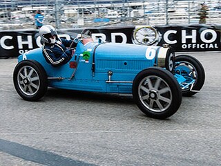 A well-known and discerning car collector, Scheufele owns more than 30 vintage and modern automobiles. (“Not even my wife knows for sure exactly how many,” he says with a twinkle.) It’s a passion that took hold of him at a young age—his father, Karl, avidly collected Mercedes-Benzes and would take his son to vintage auctions the world over, teaching him about the world’s most beautiful cars. Karl-Friedrich even learned to drive on his father’s 1965 Jaguar Mark II 3.8. Great vintages: (Clockwise from top left) Chopard’s watch commemorating the race pit row at the Historic Grand Prix of Monaco a 1936 Silver Arrow and a Bugatti Type 35 race car