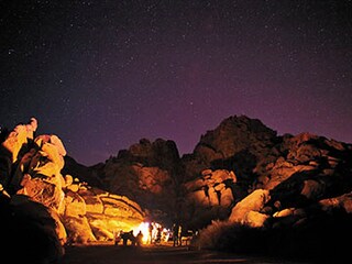 In the day, these rocks, some as high as about 60 ft, allow for incredible climbing and the routes to reach the biggest and most impressive formations are scrambled over by the intrepid hiker. The red and ochre of the rocks stand out against the beige sandy ground and the green and brown of the Joshua trees dotting the landscape. By night, though, amorphous shapes are all that are visible. In the starlight, they are all a uniform grey: Think of a herd of elephants that has decided to bunk down for the night around the campsite.