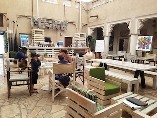 Feeling a bit like Alice, I walk into any open gate, discovering buzzing cafés inside vast courtyards dotted with white wicker chairs and sprawling trees, and hidden art galleries showcasing a wide range of work from both Middle Eastern and international artists. Prominent spaces like the XVA gallery—that comes with an art hotel and a café—and the Majlis Gallery, the UAE’s oldest, are nonchalant about visitors walking in to check out their displays.