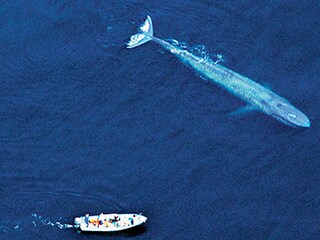 The Big BlueBlue whales are true leviathans: 30 metres long and 180,000 kg in weight, a tongue that weighs as much as an elephant, an aorta that a man can swim through, and daily consumption of up to 3 million calories, equivalent to 8,000 kg or 8 million krill (a small shrimp-like crustacean).