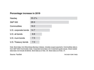 After a 0.3% gain on Tuesday, the S&P 500 index ended 2019 up 28.9%, its strongest performance since 2013 and one of the best in decades. Broad indexes of the American bond markets are up nearly 9%. Gold jumped 18.7% and silver about 15%, and other commodities were also up. (Futures prices for hogs, in case that had been your pick, gained about 17%.)