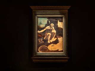 Leonardo’s painting does not. Here saint and beast alike are untamed. This is the Jerome of desert wildness, or maybe the one who ended up dying far from Rome in a rock-hewn cave near Bethlehem. Aged, nearly toothless and sun-scorched, he holds a stone in his extended right hand, as if about to deliver a penitential blow to his chest. At his feet is the lion, sleek, alert, tail curled like a scimitar, mouth opened wide in a growl.