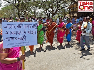 As part of the Save Aarey protests, Warli adivasis from 27 hamlets in Aarey Milk Colony protested outside the Aarey Dairy office on May 28 2019 against plans to resettle them in rehabilitation buildings to make way for various development projects Image: Satyabrata Tripathy/Hindustan Times via Getty Image[br]