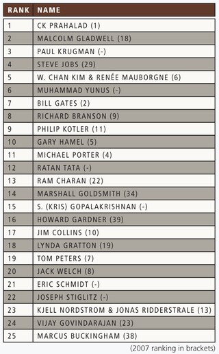 We then take soundings from experts we trust throughout the world and factor in other measures, such as number of Google hits. Throughout the process we work in business schools and at events worldwide continuously asking who is making an impression or set to make an impression on managers and leaders.