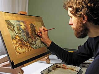 In fact, the painting I am watching him work on has been patiently dabbed at and has received the deft strokes of a brush for close to a month now. It’s upon gleaning this piece of information that the ‘a week in the life of a children’s book illustrator’ story that I’ve been planning goes right out of the window. Because I learn that this is pretty much Rock’s week. Long hours painting at his desk. All day. Every day. Punctuated, on occasion, with a sudden existential conversation with Ichabod, his cat. But it’s these very hours, perhaps aided by the feline tête-à-tête, that lead to some very beautiful and rather mysterious picture book panels. Panels that help tell stories that appeal most certainly to children. But that also have quite an effect on adults.