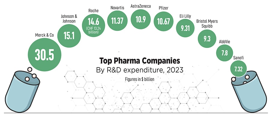 “For years now, innovator drugs have always been a priority for most global pharma giants," explains Vishal Manchanda, senior VP, institutional research, Systematix Group. Danish drugmaker Novo Nordisk’s blockbuster drugs, Ozempic (for diabetes) and Wegovy (for obesity), have been a result of continued investment in R&D—14 percent in 2023. Pharma giant Merck & Co spent about $30.5 billion on R&D in 2023, about 51 percent of its total revenue and Novartis spends over $11 billion on its R&D pipeline, which is almost 25 percent of its sales.