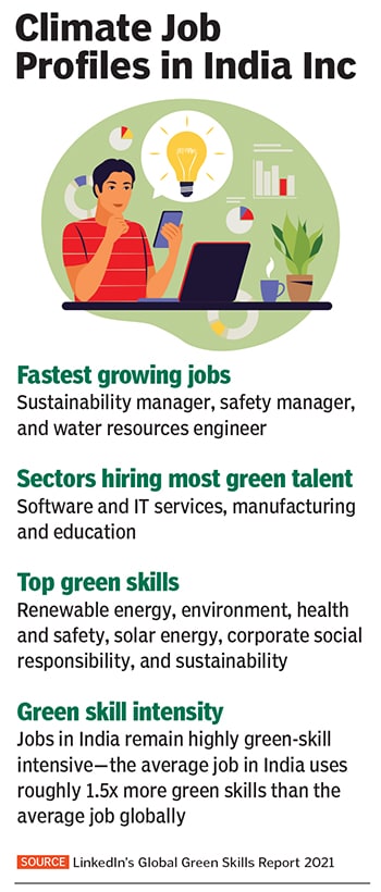 LinkedIn’s global green skills report 2022 reveals that sustainability manager, safety manager, and water resources engineer are the top three fastest-growing green jobs in India. And sectors like software and IT services, manufacturing, and education are the biggest recruiters. “Jobs in India remain highly green-skill intensive—the average job in India uses roughly 1.5x more green skills than the average job globally," the report claims.