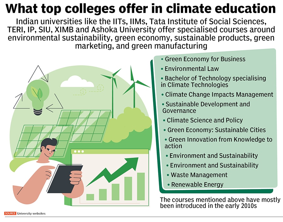 India’s educational institutions are realising the potential of green jobs and are actively working towards bridging the climate skills and demand gap by creating multiple climate-centric courses. IITs, IIMs, Tata Institute of Social Sciences, TERI, IP, SIU and XIMB, among others, now offer specialised courses around environmental sustainability, green economy, sustainable products, green marketing and green manufacturing, to name a few.