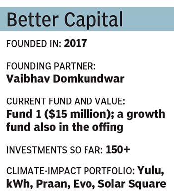 Addressing The Pre-Seed Gap Vaibhav Domkundwar’s Better Capital has ‘climate’ as a separate tab prominently on its website. “It is intentional," Domkundwar says. He has been investing in startups and backing entrepareneurs for several years—from the time he was an entrepreneur in Silicon Valley. He returned to India 10 years ago to follow that pursuit from him hometown, Pune.