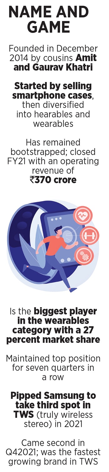 Since then, there was no looking back. Sales grew at a brisk pace. From ₹ 42 crore in FY19, the revenue from operations jumped to ₹ 156 crore in FY20 and closed the next fiscal at ₹ 373 crore. For the bootstrapped brand, there was decent growth in PAT (profit after tax) as well—₹ 1.81 crore, ₹ 18.4 crore and ₹ 32.89 crore, respectively. The upward curve was also due to the fact that the Indian market for wearables exploded over the last two years. While in 2020, the country sold 2.63 million units of smartwatches, the numbers pole-vaulted over four times to 12.23 million in 2021.
