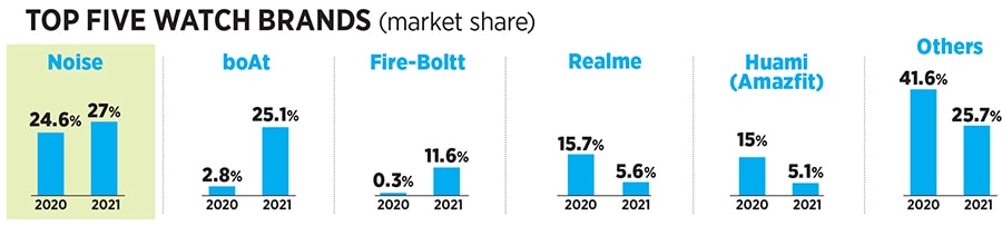 But is Noise missing the big story? In a market dominated by deeply-funded players like boAt, smartphone biggies such as Samsung, Xiaomi and Vivo, and a clutch of aggressive homegrown players like Fire-Boltt, remaining bootstrapped might be a baggage as the biggest wearables brand gets ready to undertake the 1 to 10 journey. The competitive decibel has risen by multiple notches. Let us look at how the rivals are snapping at the heels of Noise in the watch category. boAt, which had a paltry 2.8 percent share in 2020, has raced to a staggering 25.1 percent in 2021. Then there is Fire-Boltt, whose market share has increased from 0.3 percent to 11.5 percent during the same period. In contrast, Noise inched from 24.6 percent to 27 percent. The throne might be in danger.
