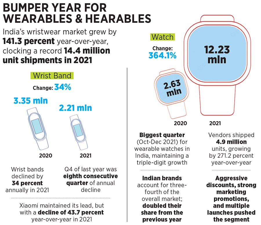 In fact, during the last quarter of 2021—October to December—wearable watches in India maintained a triple-digit growth as vendors shipped 4.9 million units, growing by 271.2 percent year-over-year, according to data by IDC. The reasons are obvious. Aggressive discounts, strong marketing promotions, and multiple launches pushed the segment. Interestingly, Indian brands accounted for three-fourth of the overall market, and doubled their share from the previous year.