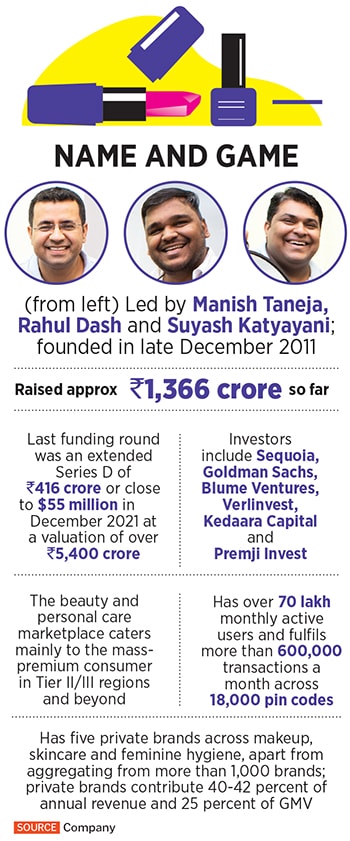 Its cap-table is enviable, and includes investment firms Sequoia, Goldman Sachs, Blume Ventures, Verlinvest, Kedaara Capital and Premji Invest. It competes directly with Falguni Nayar-led Nykaa, which had a phenomenal stock market debut last year.