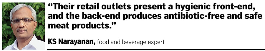 Commenting on the group’s bullishness with the B2C arm, Nandu’s, Narayanan maintains that the brand has a huge edge in the meat market, which is highly unorganised and has a lot of health and hygiene concerns. By setting up retail outlets that present a hygienic front-end and by owning the entire back-end, the group has been banking big on its promise of selling antibiotic-free and safe meat products. “During and post-Covid, this helped the brand," he says, adding that the move to stay confined to Bengaluru and Hyderabad for the first few years helped it understand the market and consumers, and reduce cash burn, which any operationally heavy consumer venture would face in the initial phase.