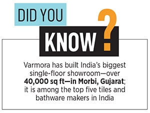 Since then, there was no looking back. From `811 crore in operating revenue in FY19, Varmora closed FY22 at Rs 1,105 crore. Net profit during the same period increased from Rs 35.2 crore to Rs 67.6 crore. The Morbi-based company is among the top five tiles and bathware makers in India, and has nine manufacturing units in Gujarat. It is available across 5,000 retail outlets, has 700 dealers, 12 branch offices and 325 exclusive showrooms in India, and 15 across the world. It also exports to over 74 countries, and in June, private equity major Carlyle bought a minority stake in the company.