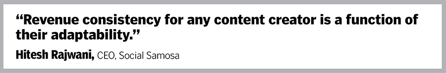 “Revenue consistency for any creator is a function of their adaptability," says Rajwani. “If you see over time that your content is hitting a roadblock and you are not getting views or followers, you need to change tracks and find ways to build new business models on top of your content creation."