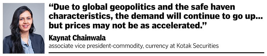 “Global geopolitics and the safe haven characteristics will continue to see demand for gold going up, even from current levels. But prices may not be as accelerated as we have seen in the last 18 months," she tells Forbes India. She forecasts gold prices to gain 8 to 10 percent from current levels.