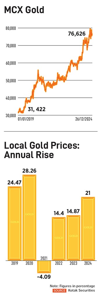 “Any uncertainty will impact gold prices. Why we expect a modest run for gold and risk to the outlook is due to the recalibration of interest rate cuts by the Federal Reserve," she adds. A majority of bankers now project just two quarter point rate cuts till the end of 2025. “Rate cuts, potential tariffs on US imports, tax cuts and immigrant policies are all inflationary, so the Fed cannot continue to keep cutting rates too much. Hence gold prices may not rise too much," she explains.