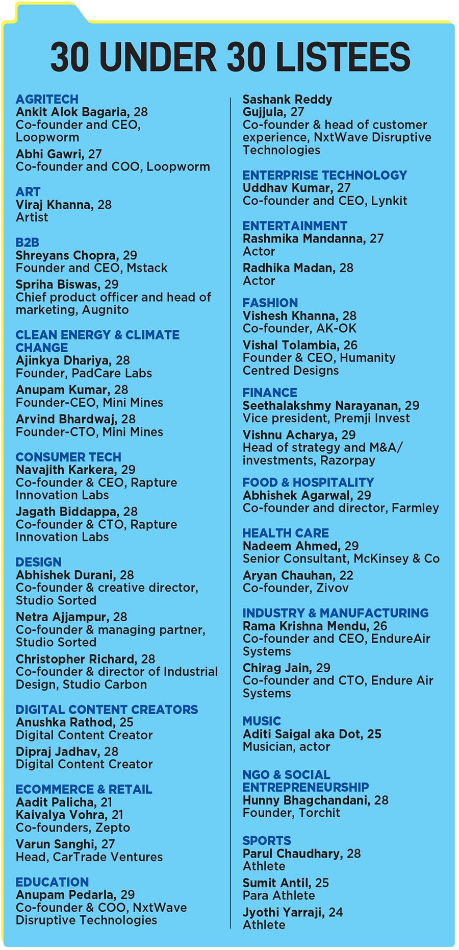 The research process was three-fold: One was interviews by the Forbes India team with sources across relevant categories as well as through studies of databases and media coverage. Two, on forbesindia.com, inviting applications from, or nominations of, entrepreneurs and professionals who fit the criteria. Three, spreading the word on social media. This helped us arrive at a long list across 20 categories, including a new one—B2B—this year. The next step was narrowing it down to a ‘shorter longlist’—the names most likely to make it to the Top 30, decided in consultation with experts in each category. The last stage was finalising the 30 winners for 2024. Armed with expert views, the Forbes India editorial team debated, argued, and vetoed its way down to the final 30 from close to a thousand nominations. We have only considered for selection those who were under the age of 30 as of February 29, 2024 (the cut-off date for selection of the list). And, in the case of enterprises that have several co-founders, we have considered only those where at least one of them is under 30.